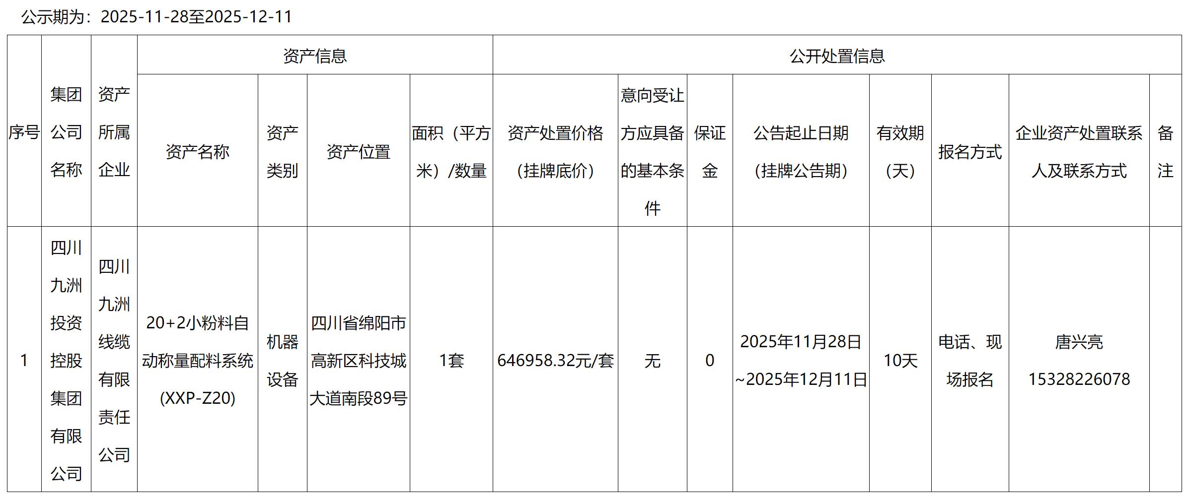 四川九洲線纜有限責任公司物理發(fā)泡生產(chǎn)設(shè)備資產(chǎn)處置公告