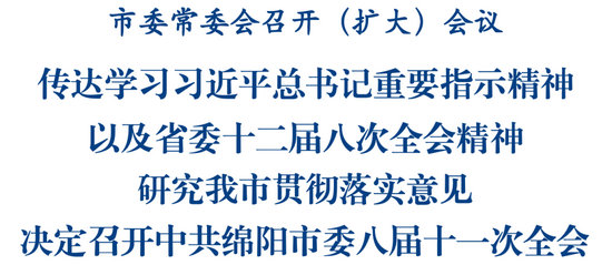會(huì)議決定,今年12月上旬召開中共綿陽市委八屆十一次全會(huì),深入貫徹黨的二十屆四中全會(huì)精神,認(rèn)真落實(shí)省委十二屆八次全會(huì)精神,研究關(guān)于制定綿陽市國民經(jīng)濟(jì)和社會(huì)發(fā)展第十五個(gè)五年規(guī)劃的建議。