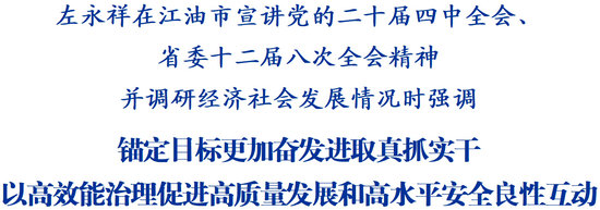 調(diào)研期間,左永祥聽取了江油市經(jīng)濟社會發(fā)展情況匯報,對相關(guān)工作取得的成績給予肯定。他指出,江油歷史底蘊深厚,產(chǎn)業(yè)基礎堅實,要繼續(xù)保持發(fā)展定力和韌勁,進一步補短板、鍛長板,努力在新起點上推動高質(zhì)量發(fā)展邁上新臺階。要鞏固壯大工業(yè)經(jīng)濟根基,聚焦先進材料、高端裝備制造等主攻方向,推動工作力量、資源要素聚集,統(tǒng)籌好傳統(tǒng)產(chǎn)業(yè)與新興產(chǎn)業(yè)、未來產(chǎn)業(yè)的關(guān)系,加快傳統(tǒng)產(chǎn)業(yè)“智改數(shù)轉(zhuǎn)”、科技賦能步伐,推動特色優(yōu)勢產(chǎn)業(yè)建圈強鏈,因地制宜發(fā)展新質(zhì)生產(chǎn)力,不斷培育壯大發(fā)展新動能。要推動文旅提檔升級,立足資源稟賦和地方特色,用好用活李白、方特等IP,切實把“文旅+”“+文旅”這篇大文章做好,加快把文化旅游業(yè)打造成為更好滿足人民群眾美好生活新期待的幸福產(chǎn)業(yè),培育成為推動經(jīng)濟高質(zhì)量發(fā)展的新增長點。要著力推動城鄉(xiāng)融合發(fā)展,扎實推進以縣城為重要載體的新型城鎮(zhèn)化建設,科學布局建設一批優(yōu)質(zhì)均衡的公共服務設施,推動城鄉(xiāng)要素融合、設施融合、治理融合,努力走出縣域經(jīng)濟高質(zhì)量發(fā)展新路徑。要筑牢安全發(fā)展底線,深入開展安全生產(chǎn)大起底、大排查、大整治,有效防范化解各類風險挑戰(zhàn),全力維護社會和諧穩(wěn)定,保障人民群眾生命財產(chǎn)安全。
