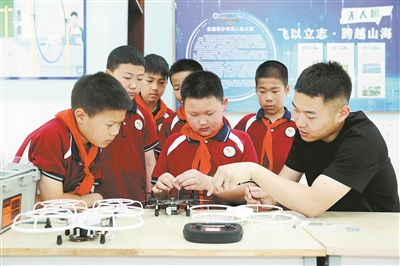 江蘇省宿遷市洋河新區(qū)實(shí)驗(yàn)小學(xué)師生進(jìn)行無人機(jī)組裝與拆卸維修。 視覺中國供圖