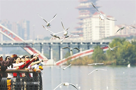 11月27日,綿陽(yáng)三江湖碼頭,紅嘴鷗翩躚起舞,與市民親密互動(dòng)。記者 陳冬冬 攝