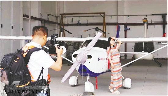 在北川永昌機(jī)場機(jī)庫內(nèi),游客在飛機(jī)機(jī)身前拍照留念。視覺綿陽資料圖片