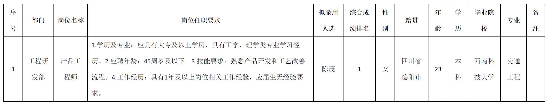 根據(jù)四川九華光子通信技術(shù)有限公司發(fā)布的招聘公告及招聘相關(guān)規(guī)定,經(jīng)測試、考察、體檢等程序,擬錄用陳茂同志到四川九華光子通信技術(shù)有限公司工作,現(xiàn)予以公示,具體情況如下: