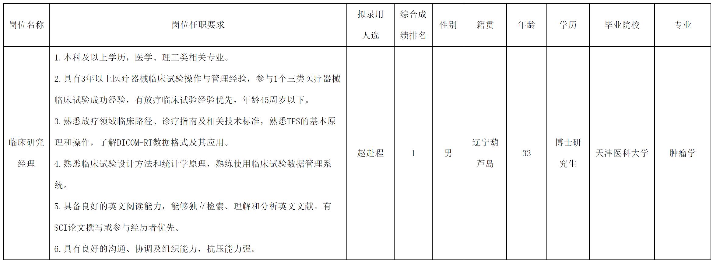 根據(jù)中玖閃光醫(yī)療科技有限公司發(fā)布的招聘公告及招聘相關(guān)規(guī)定,經(jīng)面試、考察、體檢等程序,擬錄用趙赴程同志到中玖閃光醫(yī)療科技有限公司工作,現(xiàn)予以公示,具體情況如下: