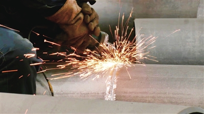 日前,在江油高新區(qū)的四川陸亨能源科技有限公司生產(chǎn)車間內(nèi),焊工正通過智能焊接機械臂對受熱面管束進行拼接。 記者 陳元松 攝