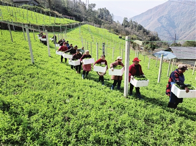 初冬的田間,一片綠意惹人注目。北川壩底鄉(xiāng)金山村村民們把裝箱好的有機豌豆尖送往集中點?!∮浾?唐云峰 攝