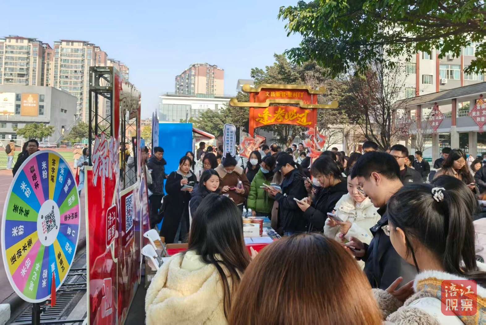 現場,拱門展架醒目矗立,“沾點‘涪’氣,成功上岸”等祝福手牌備受考生青睞,大家爭相與之合影。下載注冊涪江觀察客戶端的隊伍排起小長龍,考生們迫不及待排隊參與轉盤抽獎。