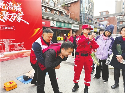 在涪城區(qū)1958沃爾瑪廣場,“蒲公英救援”志愿者向市民講解急救知識。 記者 尹秦 攝