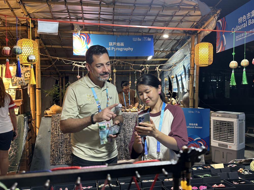 今年成都世界運(yùn)動(dòng)會(huì)期間,世運(yùn)村為工作室設(shè)了竹編攤,不少外國運(yùn)動(dòng)員上手體驗(yàn)。擊掌和擁抱不需要翻譯,也不需要聽力。
