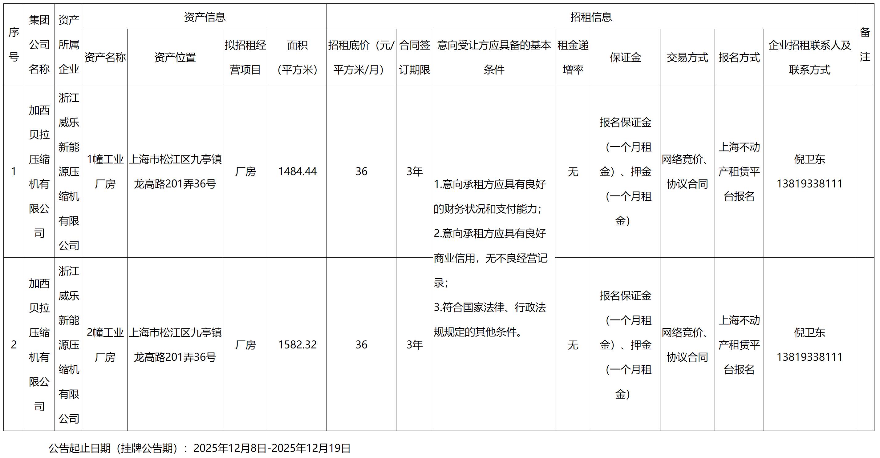 浙江威樂新能源壓縮機(jī)有限公司企業(yè)資產(chǎn)出租公告