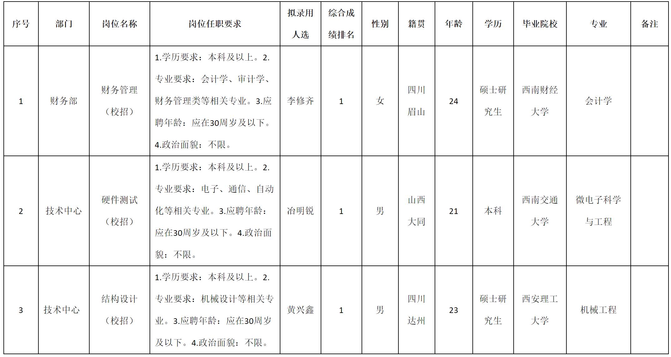 根據四川九州電子科技股份有限公司發(fā)布的招聘公告及招聘相關規(guī)定,經測試、考察、體檢等程序,擬錄用李修齊等3名同志到四川九州電子科技股份有限公司工作,現予以公示,具體情況如下: