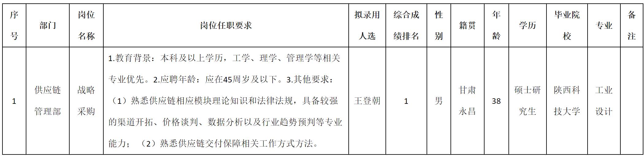 根據(jù)四川九州電子科技股份有限公司發(fā)布的招聘公告及招聘相關(guān)規(guī)定,經(jīng)測(cè)試、考察、體檢等程序,擬錄用王登朝同志到四川九州電子科技股份有限公司工作,現(xiàn)予以公示,具體情況如下: