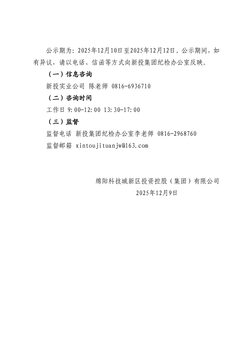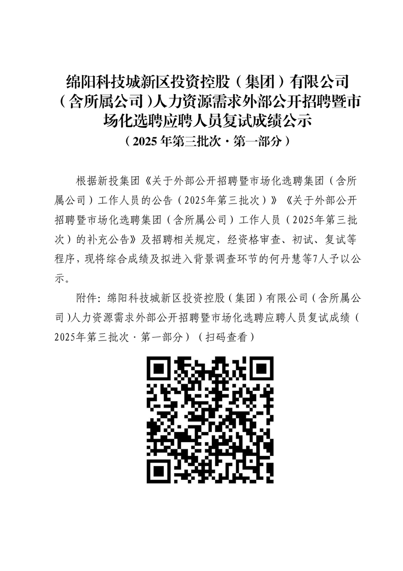 綿陽科技城新區(qū)投資控股(集團(tuán))有限公司(含所屬公司)人力資源需求外部公開招聘暨市場化選聘應(yīng)聘人員復(fù)試成績公示(2025年第三批次·第一部分)