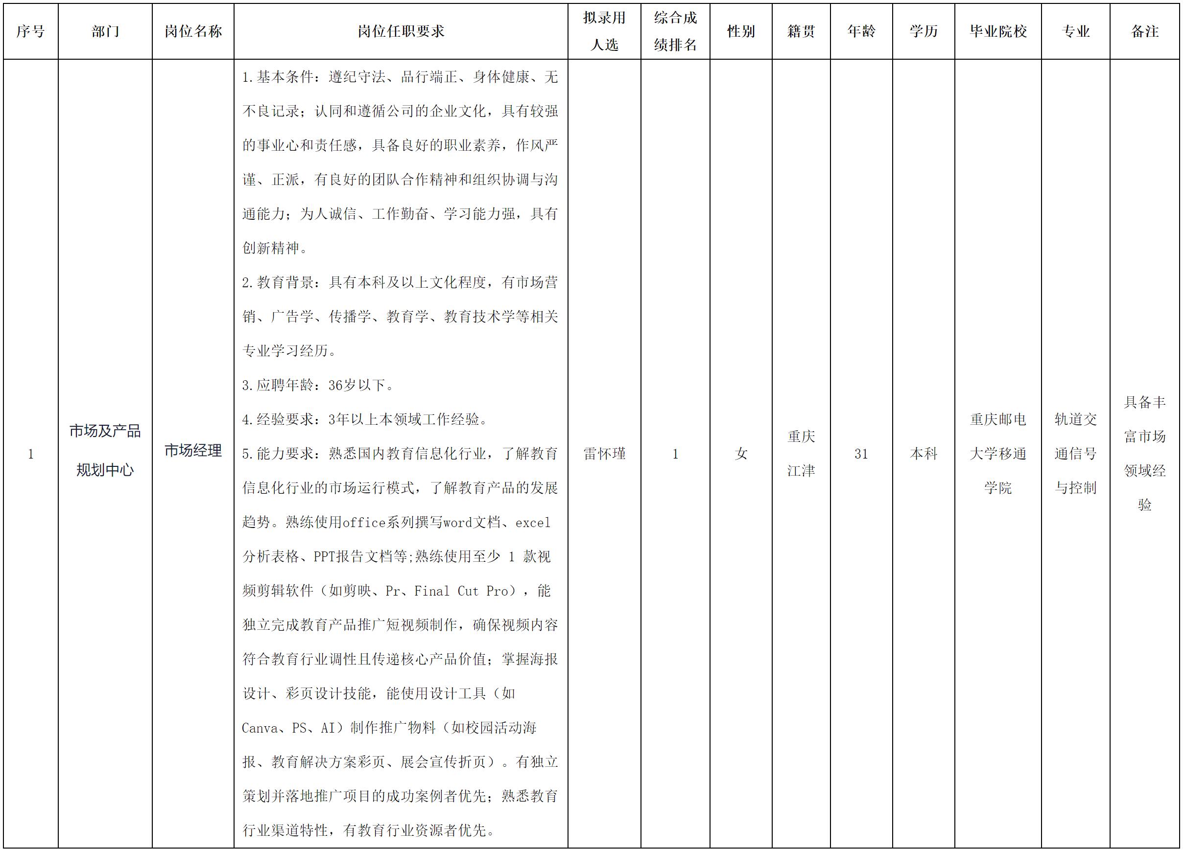 根據(jù)四川長(zhǎng)虹教育科技有限公司發(fā)布的招聘公告及招聘相關(guān)規(guī)定,經(jīng)面試、考察、體檢等環(huán)節(jié),擬錄用雷懷瑾同志到我公司工作,現(xiàn)予以公示,具體情況如下: