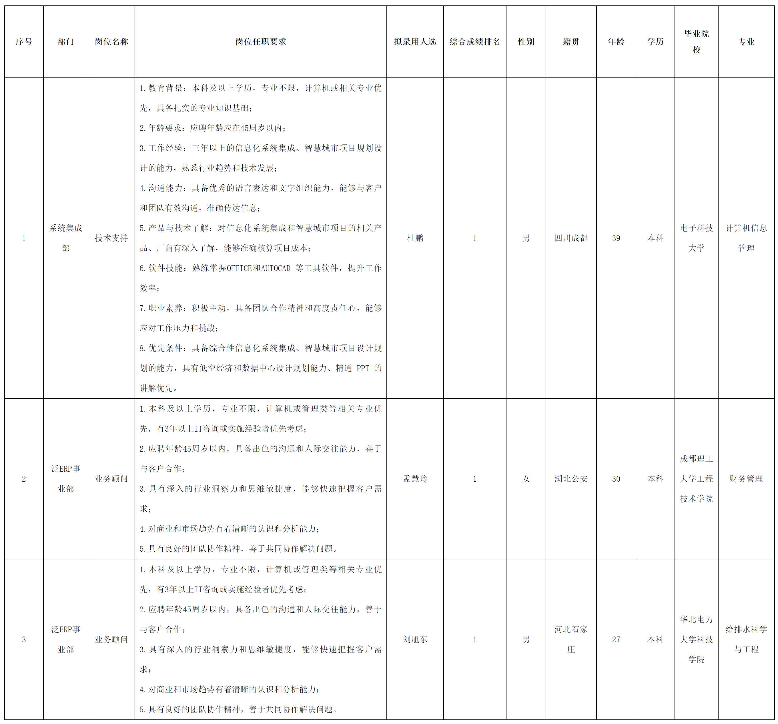 根據(jù)四川虹信軟件股份有限公司發(fā)布的招聘公告及招聘相關(guān)規(guī)定,經(jīng)測試、考察、體檢等程序,擬錄用杜鵬、孟慧玲、劉旭東同志到四川虹信軟件股份有限公司工作,現(xiàn)予以公示,具體情況如下: