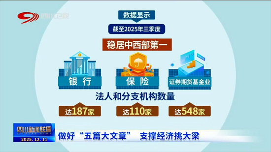 數(shù)據(jù)顯示,截至2025年三季度,全省銀行、保險、證券期貨基金業(yè)法人和分支機構(gòu)數(shù)量分別達187家、110家和548家,穩(wěn)居中西部第一,其中,金融“五篇大文章”貸款余額4.42萬億元,重點領域貸款增速均高于各項貸款增速。