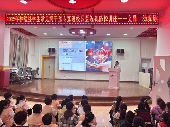 綿陽新聞網(wǎng)訊 為了有效預(yù)防近視低齡化,普及科學(xué)用眼知識,幫助幼兒樹立愛眼護(hù)眼意識,養(yǎng)成良好用眼習(xí)慣。2025年12月9日,梓潼縣疾病預(yù)防控制中心、縣人民醫(yī)院聯(lián)合專家組走進(jìn)文昌一幼,開展了以“引專家智慧·筑護(hù)眼防線”為主題的學(xué)生常見病干預(yù)專家進(jìn)校園暨幼兒近視防控講座活動。