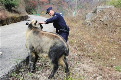 保護(hù)區(qū)的羚牛“王德福”主動親近巡護(hù)人員。 記者 劉晏男 攝