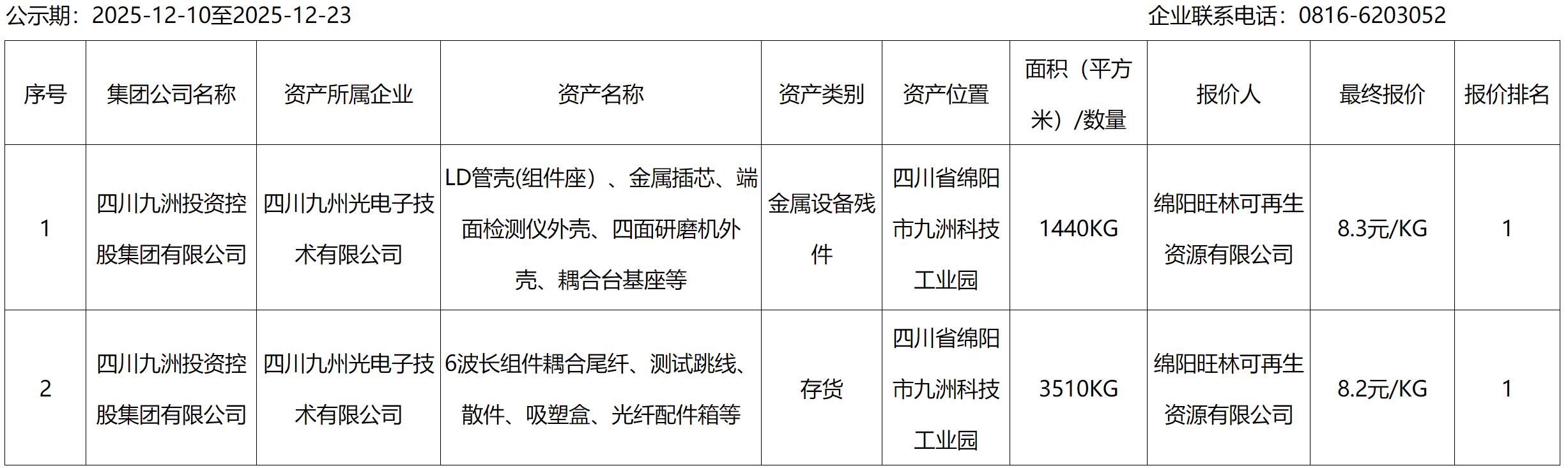四川九州光電子技術(shù)有限公司積壓物資、報(bào)廢設(shè)備資產(chǎn)處置結(jié)果公示