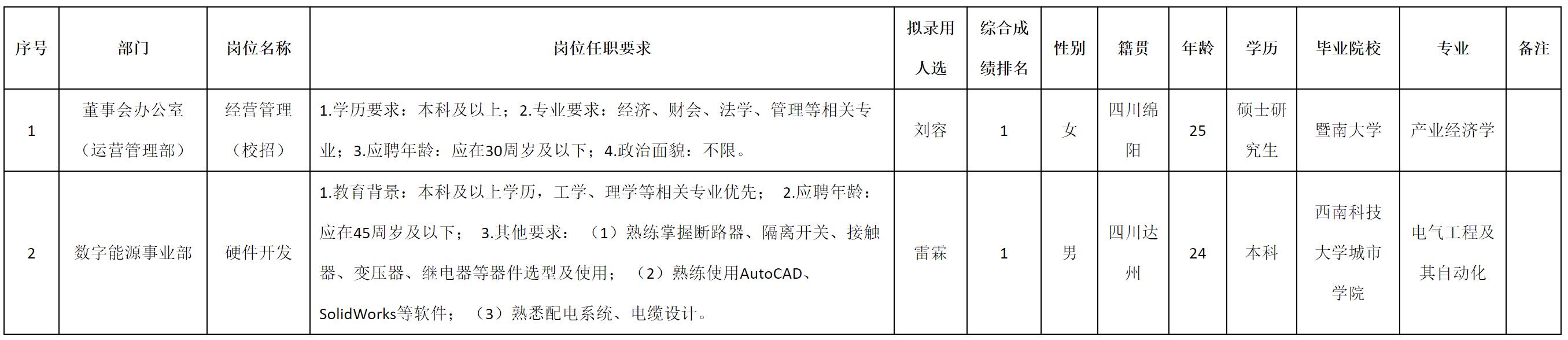 根據(jù)四川九州電子科技股份有限公司發(fā)布的招聘公告及招聘相關(guān)規(guī)定,經(jīng)測(cè)試、考察、體檢等程序,擬錄用劉容等2名同志到四川九州電子科技股份有限公司工作,現(xiàn)予以公示,具體情況如下: