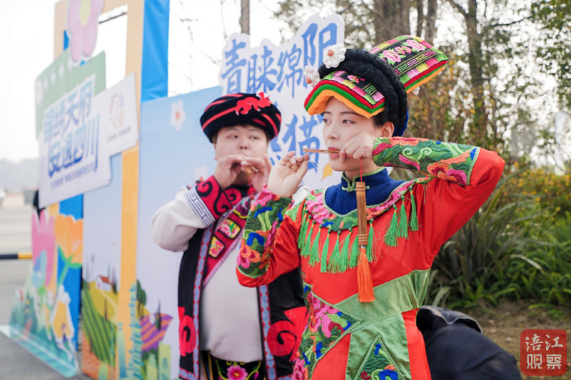 在民族風情區(qū),身穿民族服裝的漢子吹羌笛、花帽姑娘轉(zhuǎn)繡球,背景“青睞綿陽 熊貓家園”立牌與服飾相映成趣。“沒想到鄉(xiāng)村不僅有景,還有這么濃的文化味兒!”一位游客邊拍視頻邊感嘆。