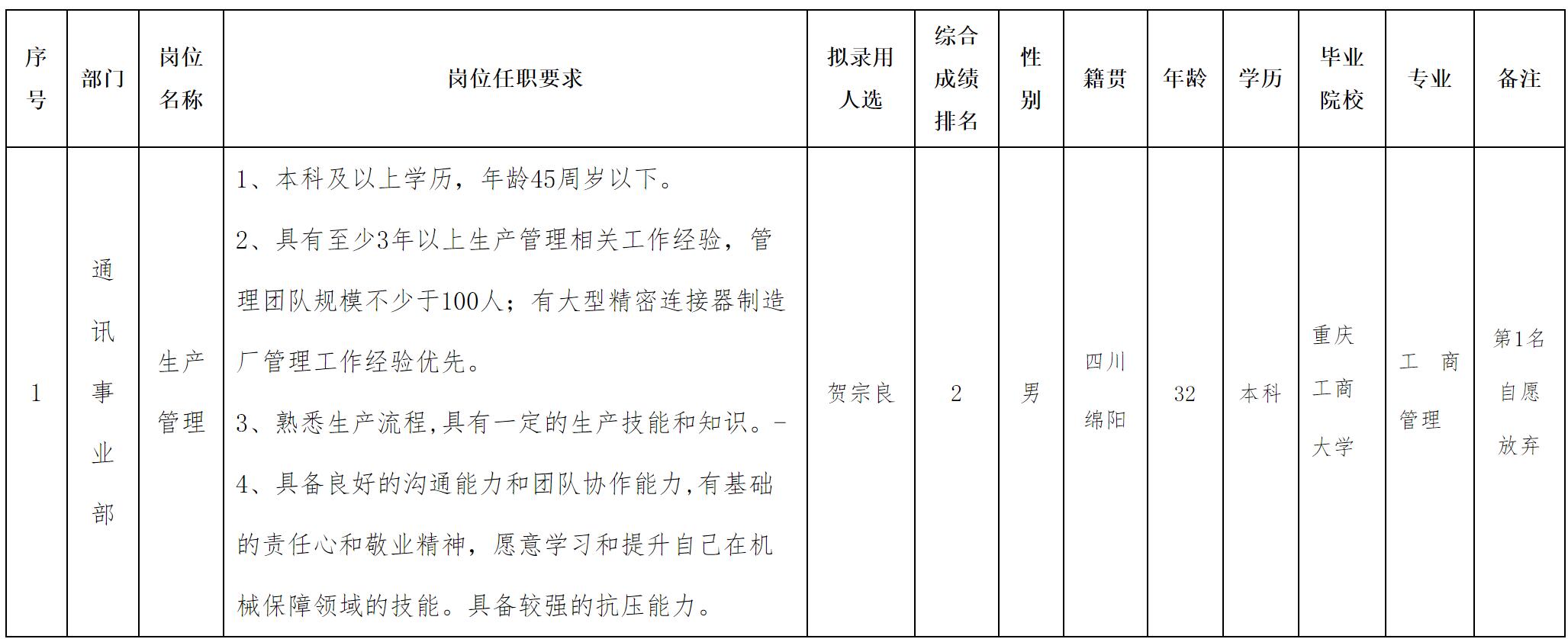 根據(jù)四川華豐科技股份有限公司發(fā)布的招聘公告及招聘相關規(guī)定,經(jīng)測試等程序,擬錄用賀宗良同志到四川華豐科技股份有限公司工作,現(xiàn)予以公示,具體情況如下: