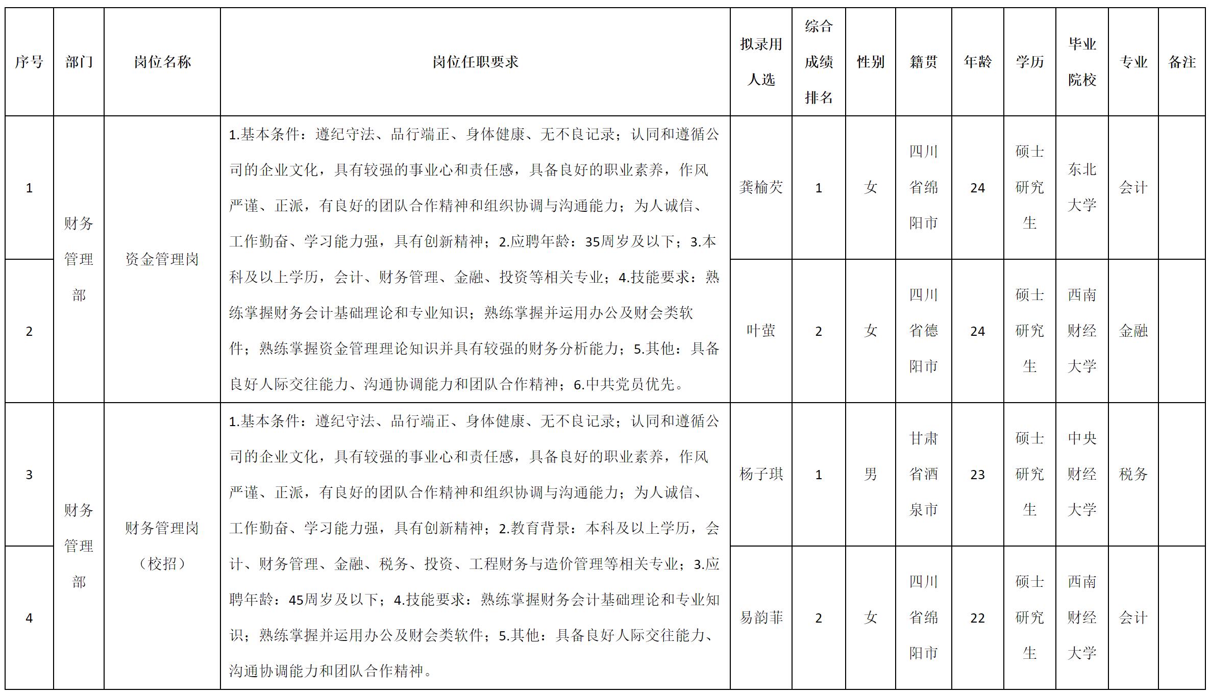 根據(jù)四川九洲投資控股集團(tuán)有限公司發(fā)布的招聘公告及招聘相關(guān)規(guī)定,經(jīng)測試、考察、體檢等程序,擬錄用龔榆芡等4名同志到四川九洲投資控股集團(tuán)有限公司工作,現(xiàn)予以公示,具體情況如下: