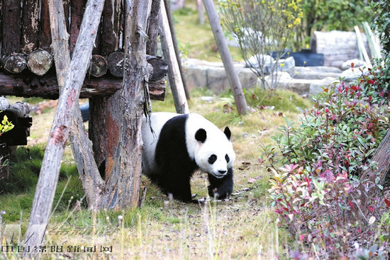 北川大熊貓動植物園內(nèi),一只大熊貓正在悠閑地玩耍。 記者 胥江 攝