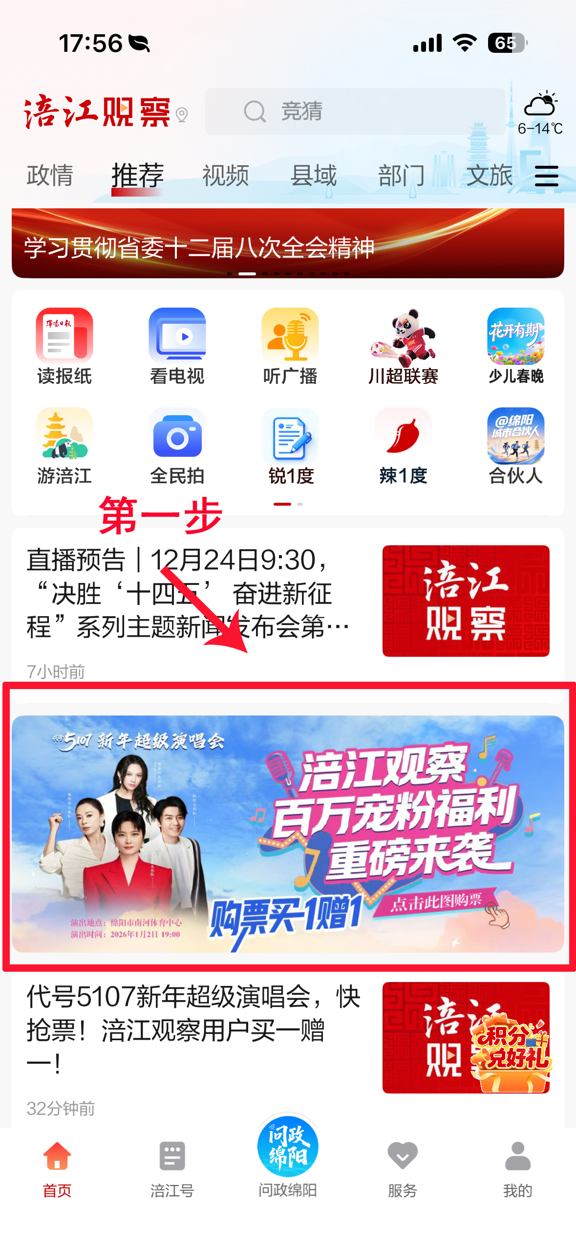 第一步:下載安裝綿陽官方新聞客戶端涪江觀察,在首頁點(diǎn)擊【涪江觀察百萬寵粉福利】購票入口,即可進(jìn)入“熊貓趕場”小程序購票頁面;