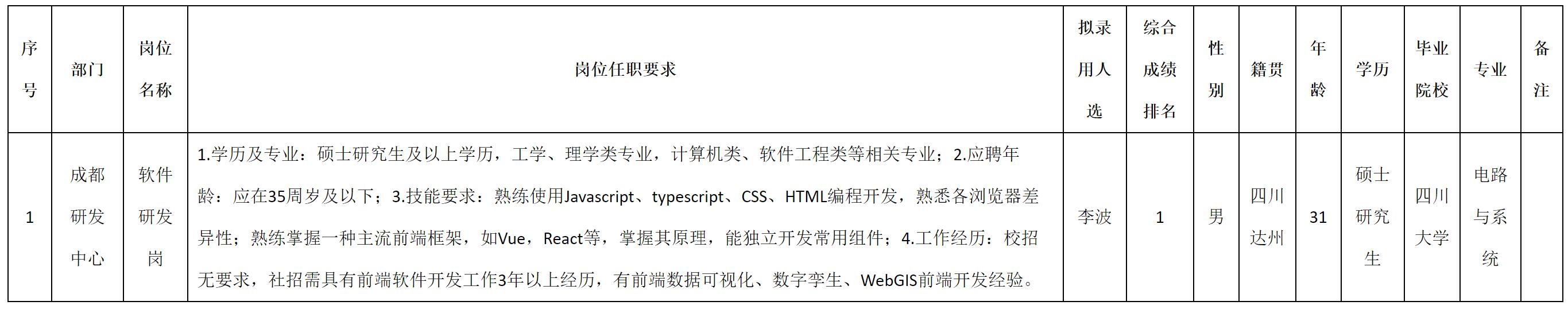 根據(jù)四川九洲空管科技有限責任公司發(fā)布的招聘公告及招聘相關規(guī)定,經(jīng)測試、考察、體檢等程序,擬錄用李波同志到四川九洲空管科技有限責任公司工作,現(xiàn)予以公示,具體情況如下: