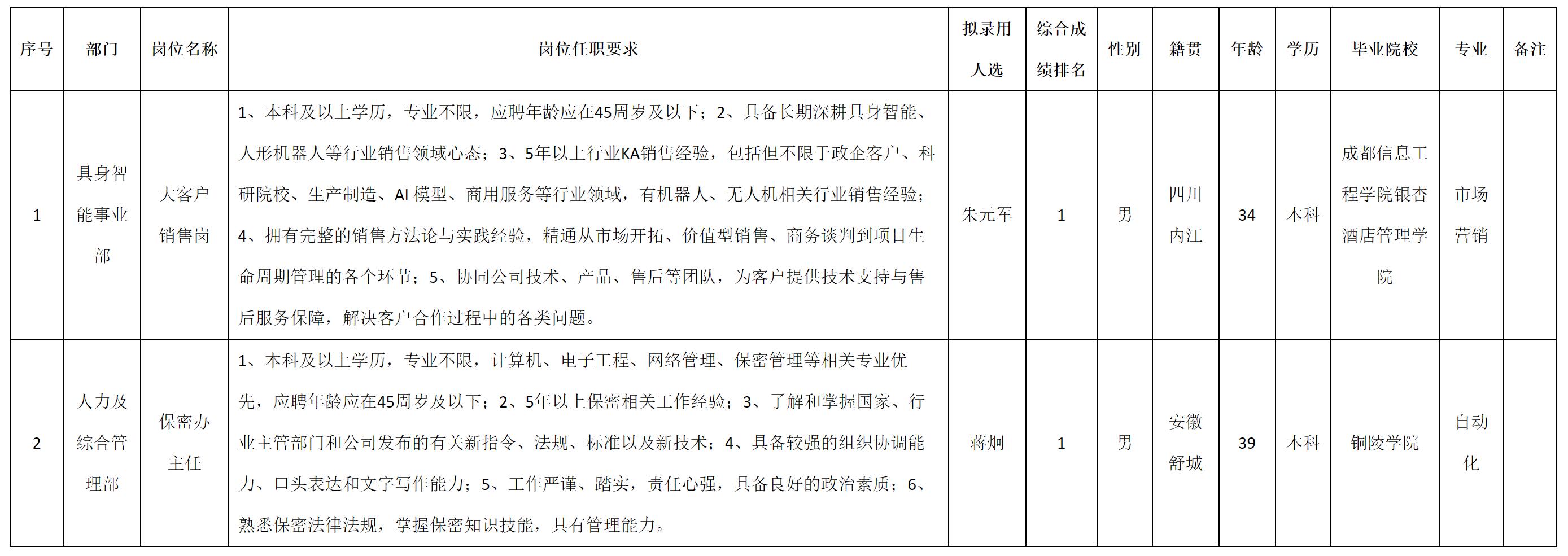 根據(jù)四川九洲投資控股集團(tuán)有限公司軟件與數(shù)據(jù)智能軍團(tuán)發(fā)布的招聘公告及招聘相關(guān)規(guī)定,經(jīng)測試、考察、體檢等程序,擬錄用朱元軍等2名同志到四川九洲投資控股集團(tuán)有限公司軟件與數(shù)據(jù)智能軍團(tuán)工作,現(xiàn)予以公示,具體情況如下: