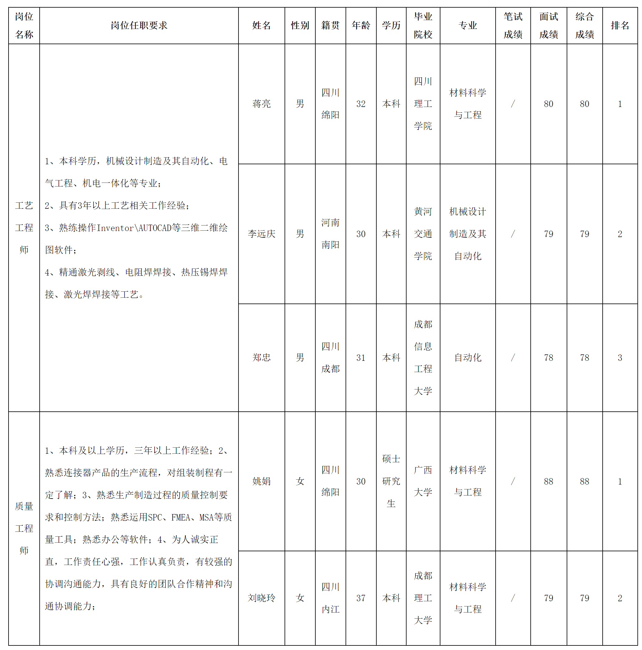 根據(jù)四川華豐科技股份有限公司發(fā)布的招聘公告及招聘相關(guān)規(guī)定,經(jīng)面試等程序,現(xiàn)將測試成績予以公示。