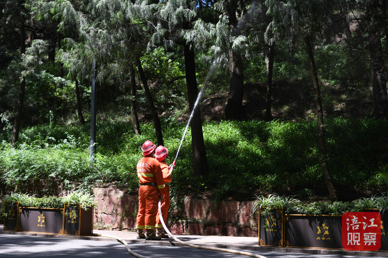 七曲山專職消防救援站消防員對翠云廊古柏進行人工降溫增濕作業(yè)。涪江觀察記者 劉曉東 蔣成林攝
