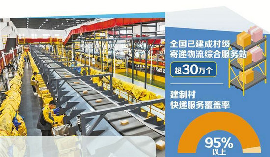 越來(lái)越多的農(nóng)特產(chǎn)品搭上快遞“快車(chē)”,從大山深處走向全國(guó)市場(chǎng)。國(guó)家郵政局?jǐn)?shù)據(jù)顯示,目前,全國(guó)已建成村級(jí)寄遞物流綜合服務(wù)站超30萬(wàn)個(gè),建制村快遞服務(wù)覆蓋率達(dá)95%以上。