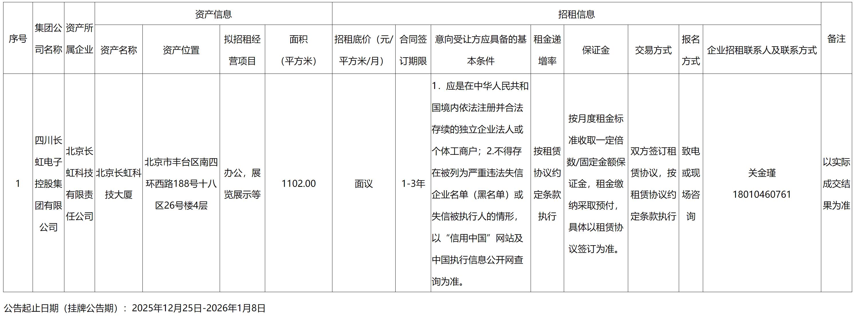 北京長虹科技有限責任公司資產(chǎn)出租公告