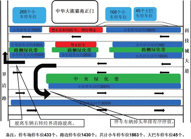 記者在綿陽中華大熊貓?jiān)吠饪吹?,全新?guī)劃的熊貓大道雙向六車道寬闊平整,交通標(biāo)線清晰醒目。市公安局交通警察支隊(duì)直屬二大隊(duì)民警聶建宇介紹,自駕游客可將車輛停放至苑區(qū)正門兩側(cè)的專用停車場,兩處停車場共計(jì)提供400余個(gè)停車位,若兩側(cè)停車場車位飽和,交警部門將增派警力現(xiàn)場值守,引導(dǎo)車輛沿熊貓大道單側(cè)有序停放。廣大駕駛員需服從現(xiàn)場指揮,規(guī)范停車,切勿隨意占道,避免造成交通擁堵。