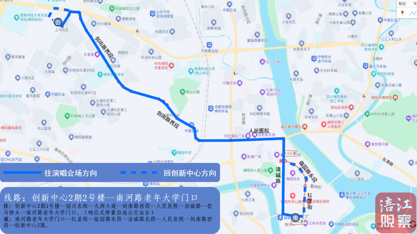 往:創(chuàng)新中心2期2號(hào)樓—園興東街—九洲大道—劍南路西段—人民醫(yī)院—涪城路—飲馬橋頭—南河路老年大學(xué)門口。(響應(yīng)式??垦赝竟徽九_(tái))