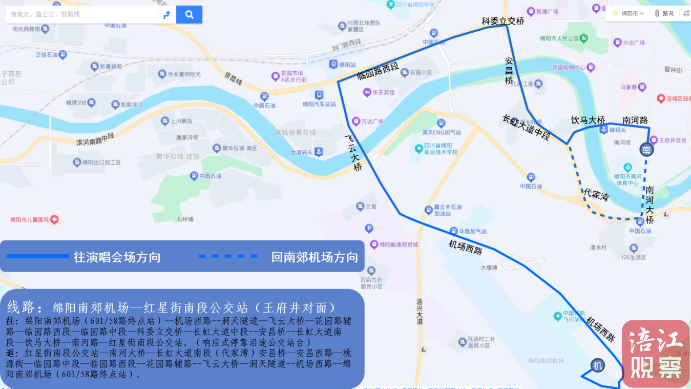往:綿陽南郊機(jī)場(601/58路終點(diǎn)站)—機(jī)場西路—洞天隧道—飛云大橋—花園路輔路—臨園路西段—臨園路中段—科委立交橋—長虹大道中段—安昌橋—長虹大道南段—飲馬大橋—南河路—紅星街南段公交站。(響應(yīng)式??垦赝竟徽九_(tái))