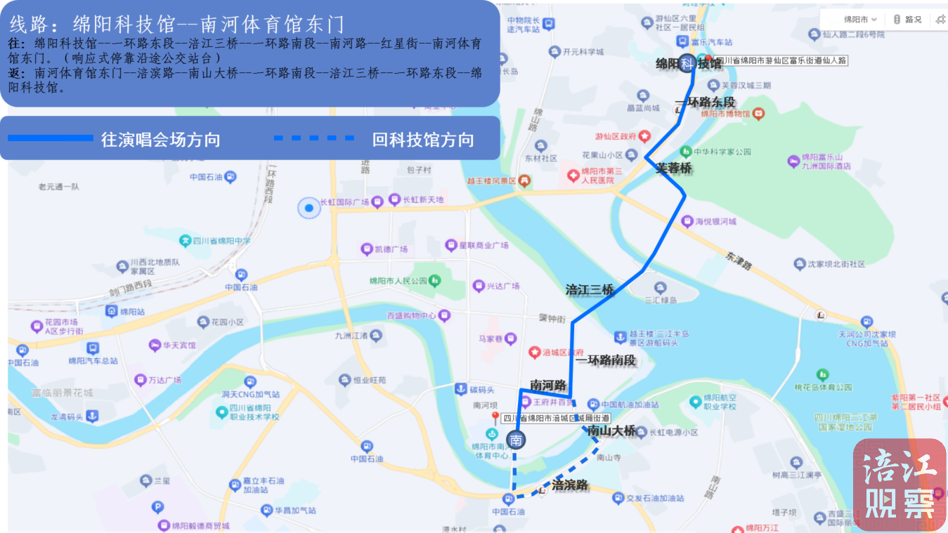 返:南河體育館東門—涪濱路—南山大橋—一環(huán)路南段—涪江三橋—一環(huán)路東段—綿陽科技館。