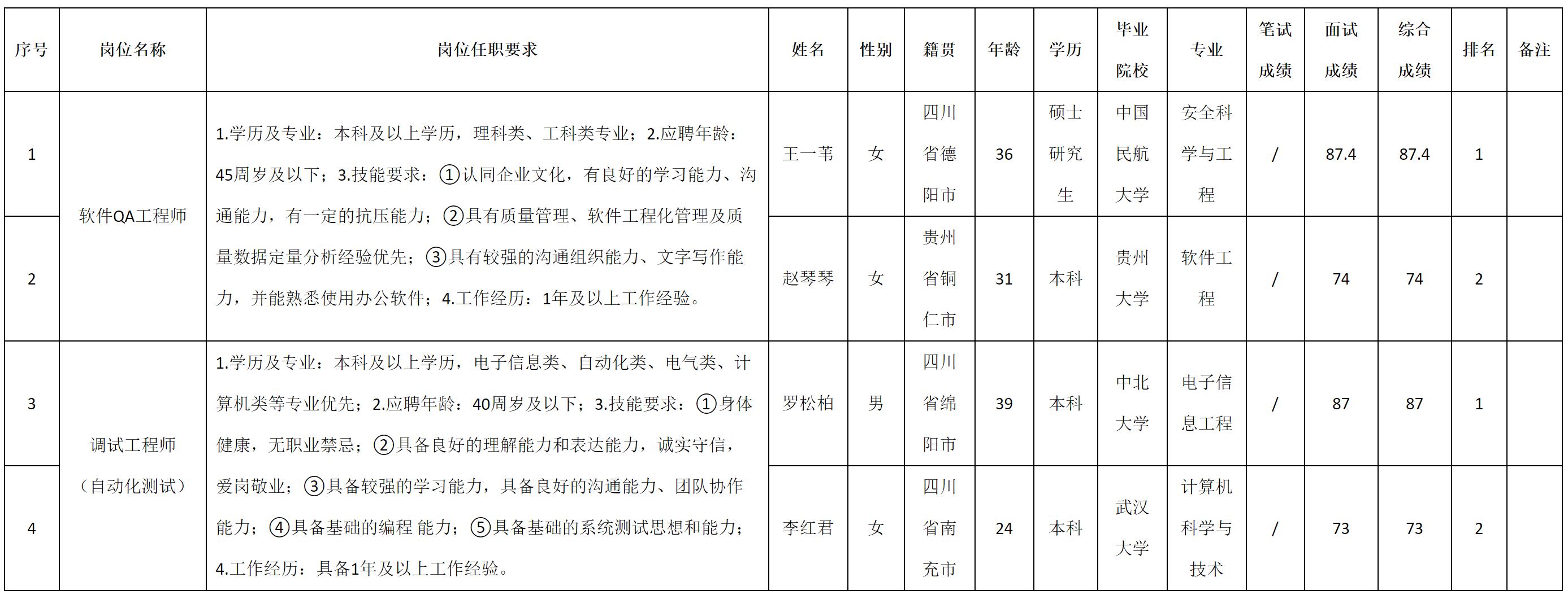 根據(jù)四川九洲電器集團(tuán)有限責(zé)任公司發(fā)布的招聘公告及招聘相關(guān)規(guī)定,現(xiàn)將測(cè)試成績予以公示。