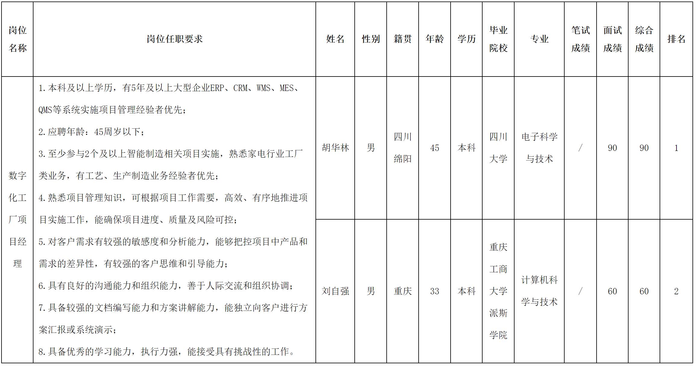 四川虹信軟件股份有限公司關(guān)于招聘數(shù)字化工廠項(xiàng)目經(jīng)理崗位測(cè)試成績(jī)的公示