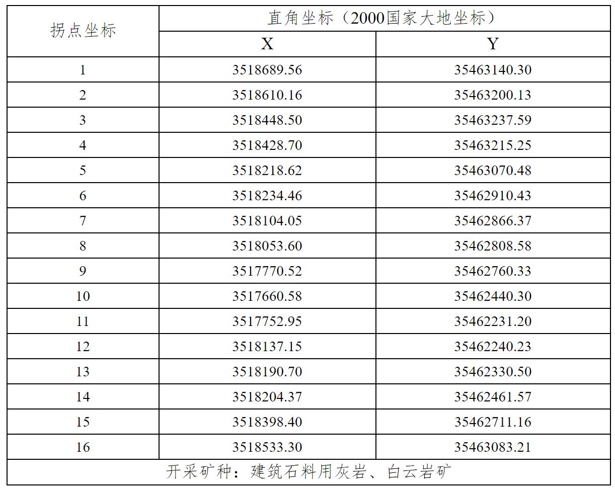 由16個拐點坐標圈閉(見下表),礦區(qū)總面積:0.434平方公里,開采標高:+970m至+785m