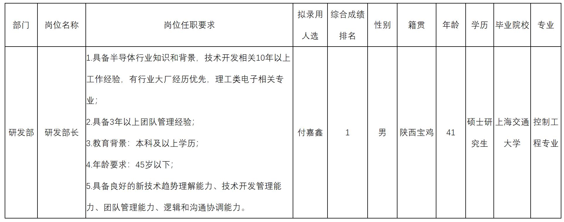 根據四川啟賽微電子有限公司發(fā)布的招聘公告及招聘相關規(guī)定,經用人單位面試程序,擬錄用付嘉鑫同志到四川啟賽微電子有限公司工作,現予以公示,具體情況如下: