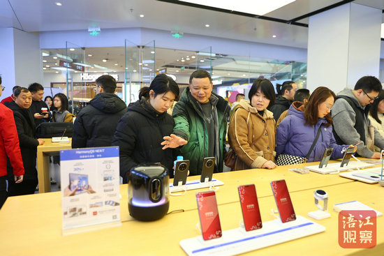 市民趙紫維帶著媽媽逛了幾家手機(jī)店后,最后決定入手國產(chǎn)手機(jī)華為。“我媽媽手機(jī)用的年限比較久了,就想換一個(gè)新的,趁著過年,我們一起來選購一下。剛好又知道有這個(gè)國補(bǔ)政策,就想趁機(jī)會(huì)買了。”趙紫維說,剛下單的手機(jī)原本售價(jià)5499元,補(bǔ)貼之后需付4999元,省了500元,很開心。