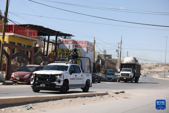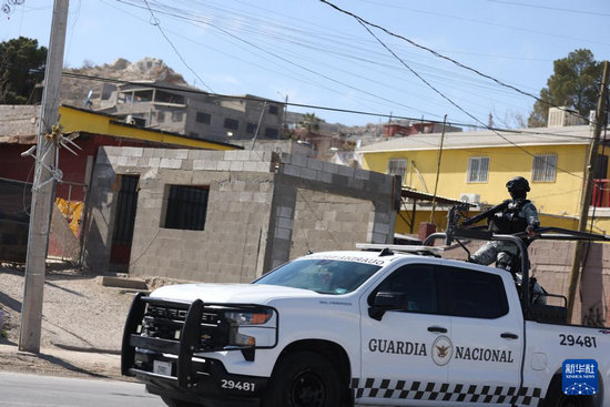 2月4日,墨西哥國民警衛(wèi)隊員在墨西哥北部奇瓦瓦州華雷斯市巡邏。新華社記者 李夢馨 攝