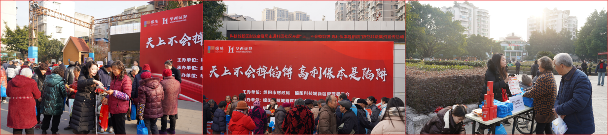 歲末年初是非法金融活動的高發(fā)期,為切實做好歲末年初防范非法金融活動宣傳教育工作,引導群眾遠離非法金融,自覺防范非法金融,12月份以來,在綿陽市財政局、綿陽市涪城區(qū)財政局、綿陽科技城新區(qū)財政金融局以及綿陽科技城財政金融國資局的指導下,華西證券投資者教育基地、華西證券科創(chuàng)金融投資者教育基地精心策劃并實施了一系列以“歲末年初,防范非法金融活動”為主題的教育宣傳活動,線下覆蓋數(shù)萬人次,發(fā)放防非宣傳資料萬余份。