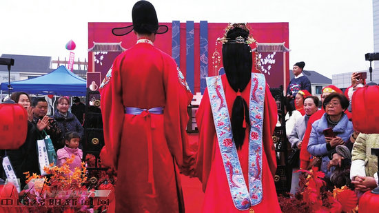 隨后,室外草坪婚禮開始,古代接親抬花轎、舞獅表演、新人婚紗走秀等輪番上演,現(xiàn)場變成歡樂的海洋。尤其是明制婚典儀式,讓圍觀人群一邊拿著手機拍照,一邊感嘆:“這種婚禮好有儀式感,太浪漫了。”