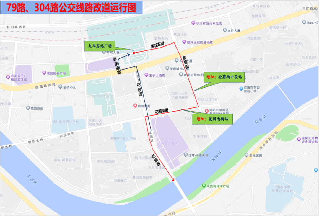 火車客站廣場(chǎng)—南郊機(jī)場(chǎng)。由火車客站廣場(chǎng)始發(fā),開往南郊機(jī)場(chǎng)方向,改道經(jīng)梅花東街、金菊街、花園南街至花園路回原線路運(yùn)行;開往火車客站廣場(chǎng)方向運(yùn)行路線不變。(304路不增加停靠站)