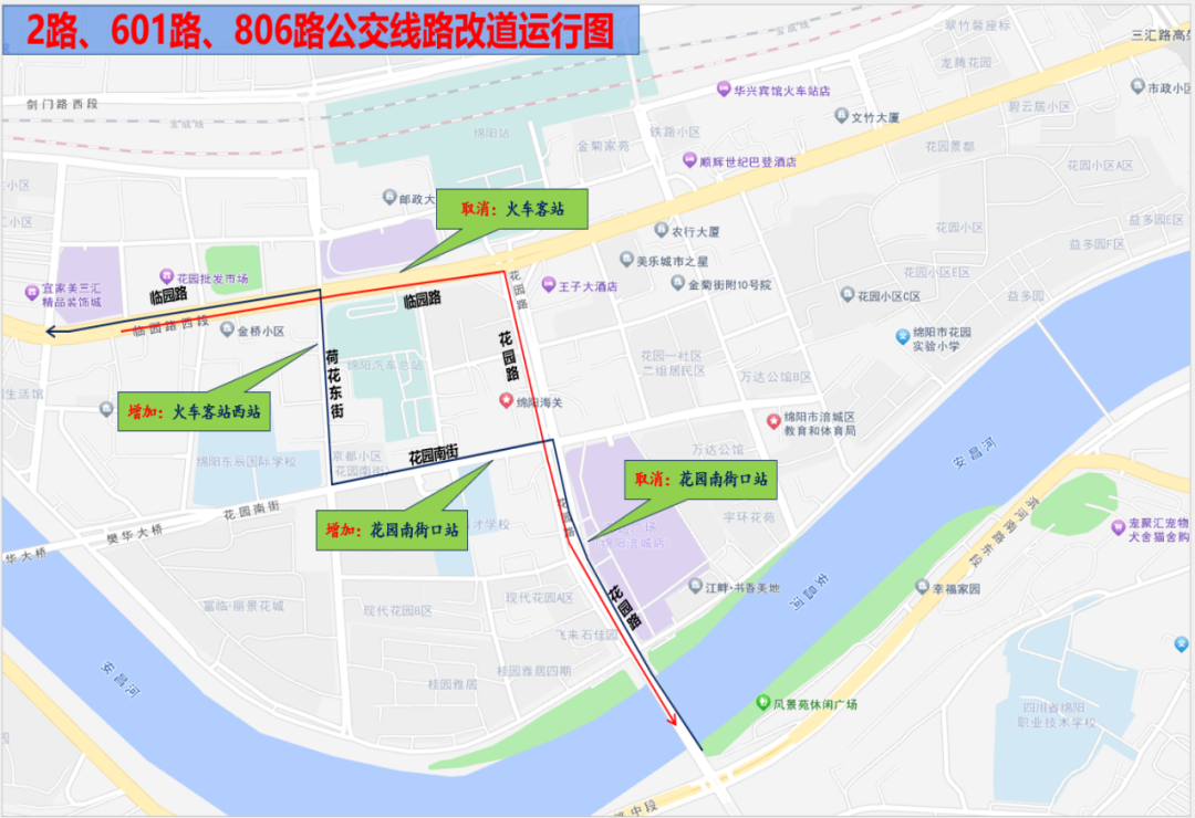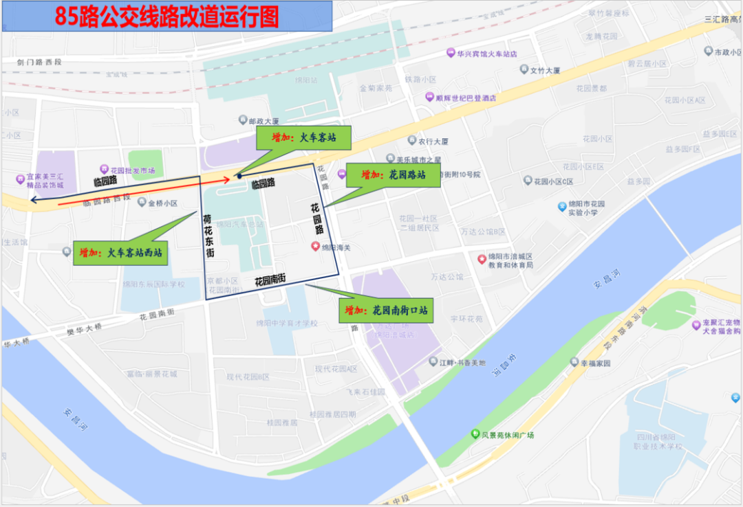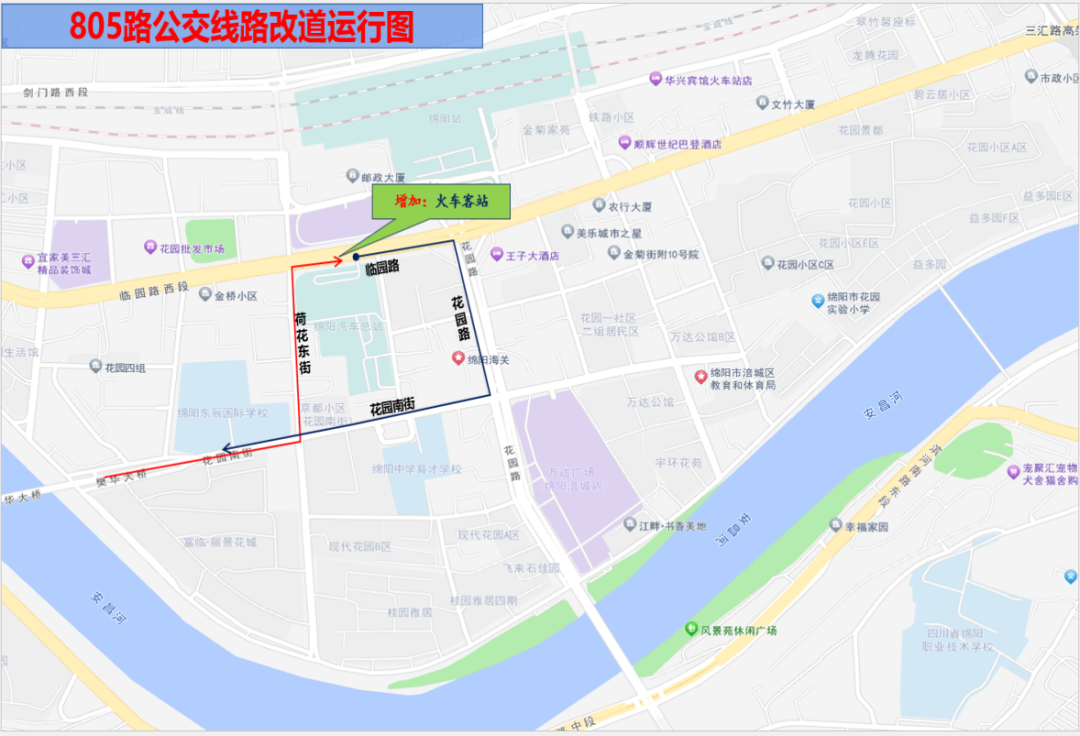 長(zhǎng)虹智能產(chǎn)業(yè)園—火車客站(改道后)。開往火車客站方向,行至荷花東街停靠火車客站西站后,改道經(jīng)臨園路至火車客站(汽車總站側(cè));返回經(jīng)花園路至花園南街回原線路運(yùn)行。