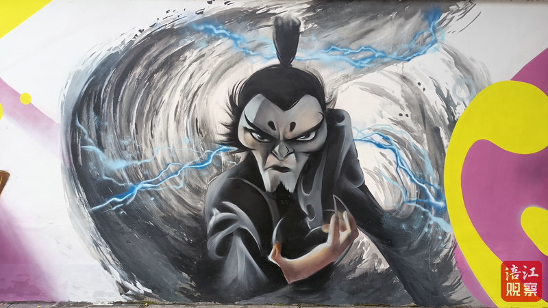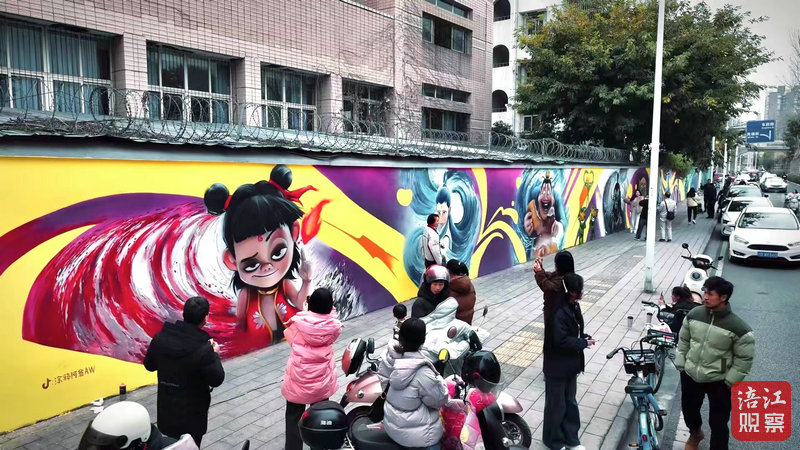 “左半幅集中描畫的是‘哪吒鬧海’的群像,右半幅則突出了李白的青年、中年、老年三個(gè)人生階段,以及他旅途中結(jié)識的摯友!”涂鴉發(fā)起人翁楚健認(rèn)為,江油既是“哪吒祖庭”,也是“李白故里”,讓兩位千古名流“同框”,是他們團(tuán)隊(duì)對江油“崇文尚武”淳樸民風(fēng)的解讀。